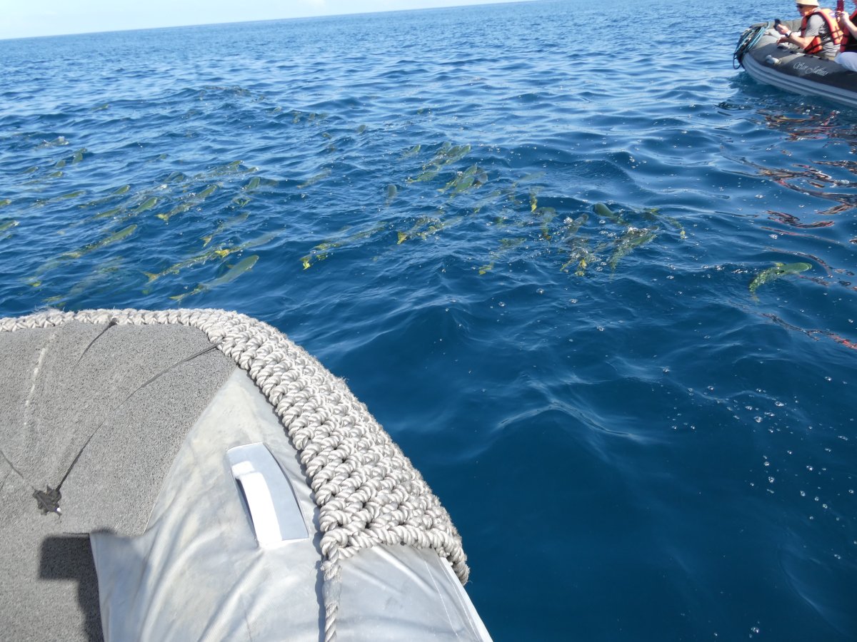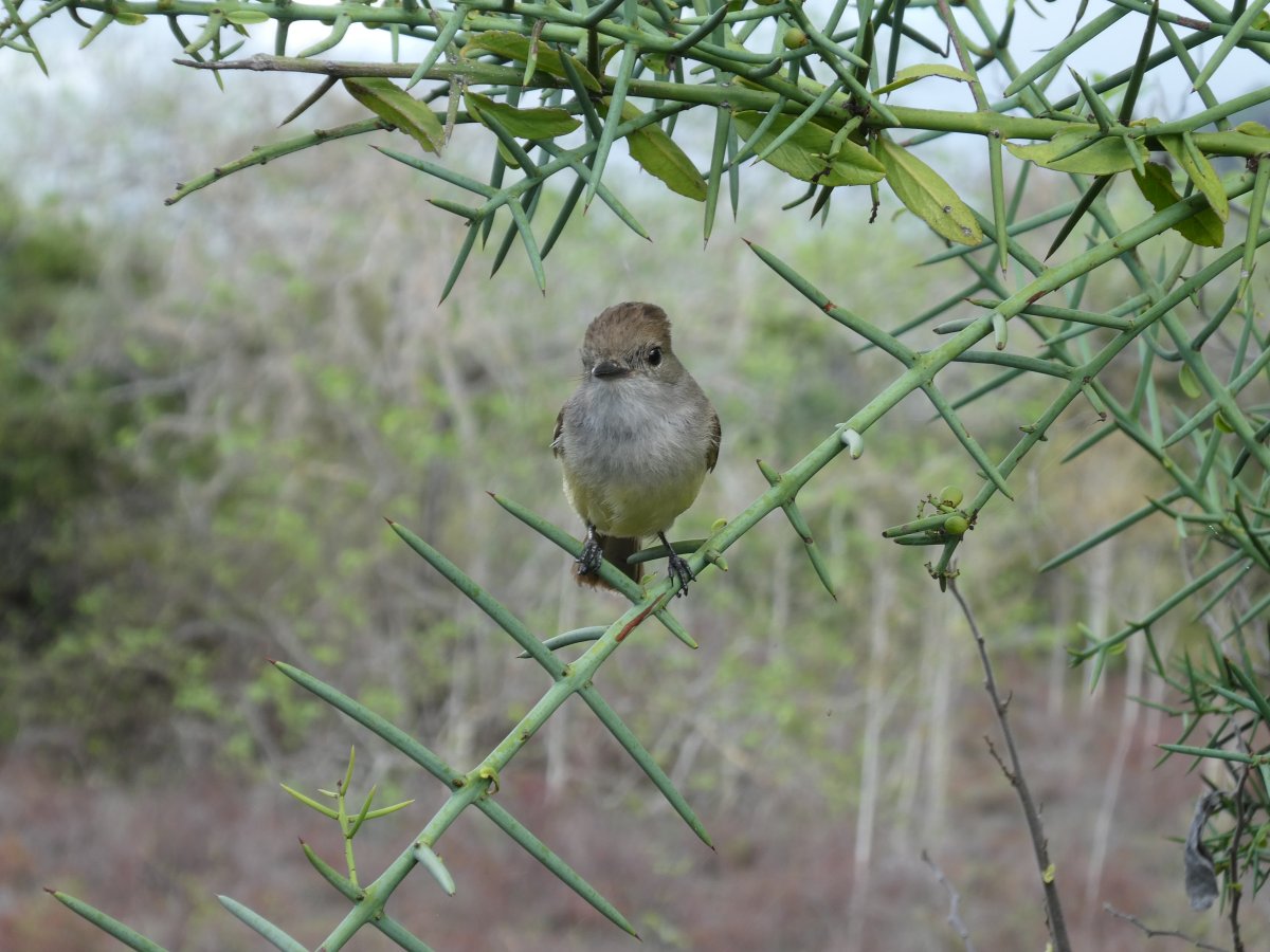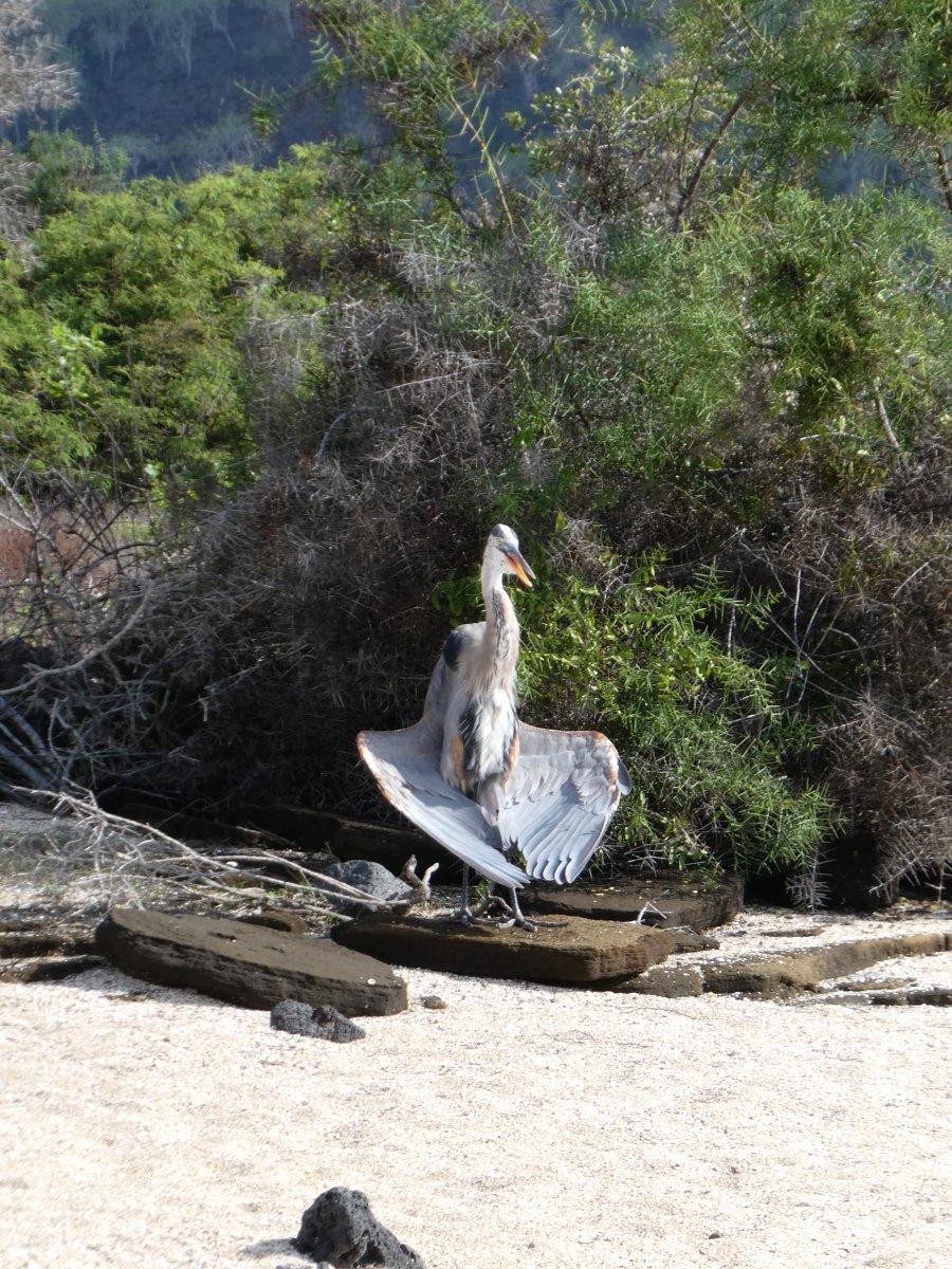 Blue heron drying his wings, a hitchhiker, hundreds of mulllets (those green fish) a land iguana, just to name a few. The little flycatcher followed us around and it's a wonder he didn't try to build a nest on one of us.