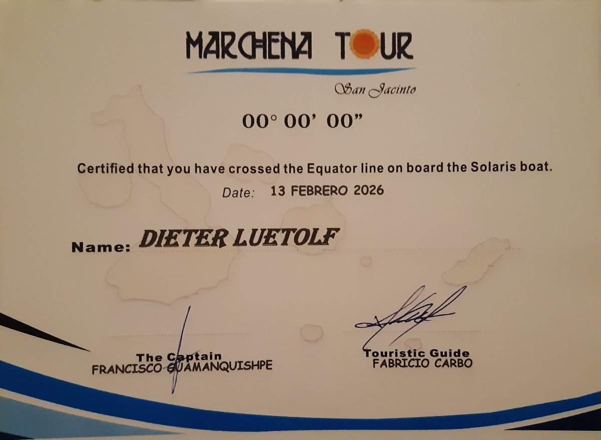 Cormoran drying his wings after fishing, our path crossed a squadron of manta rays and later somewhere north of Fernandina, we crossed the equator which prompted a minor celebration. I received a certificate commemorating my great achievement.