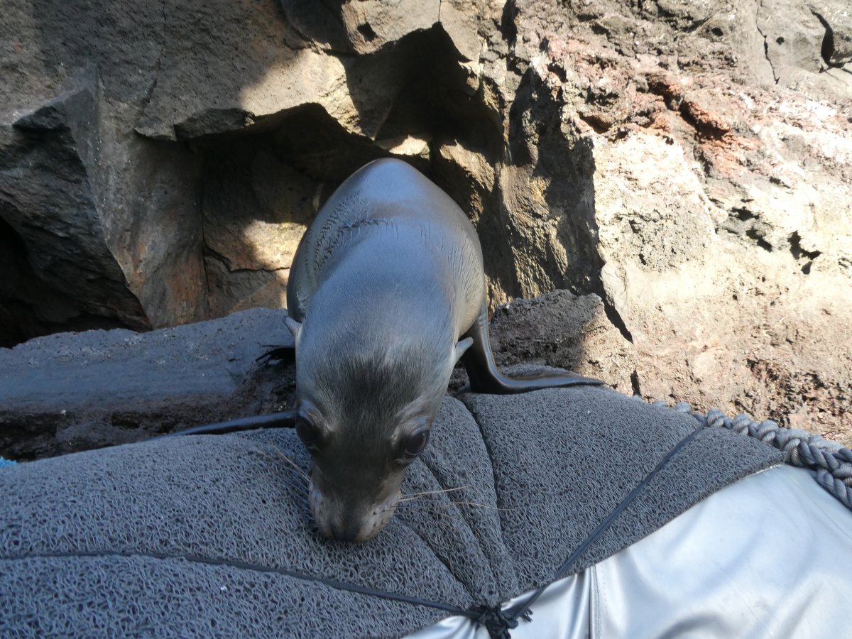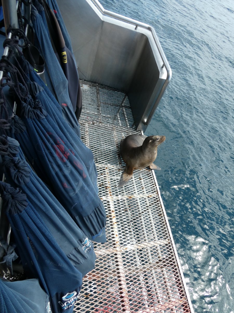 The young sealion climbed up on the boat half a meter from me and settled in for a ride. He jumped off again after a while.