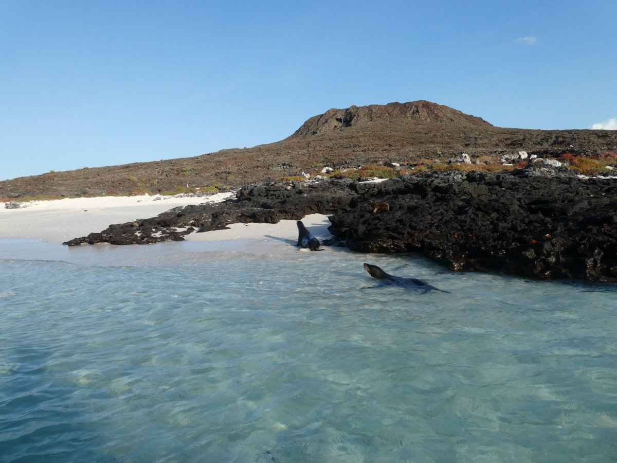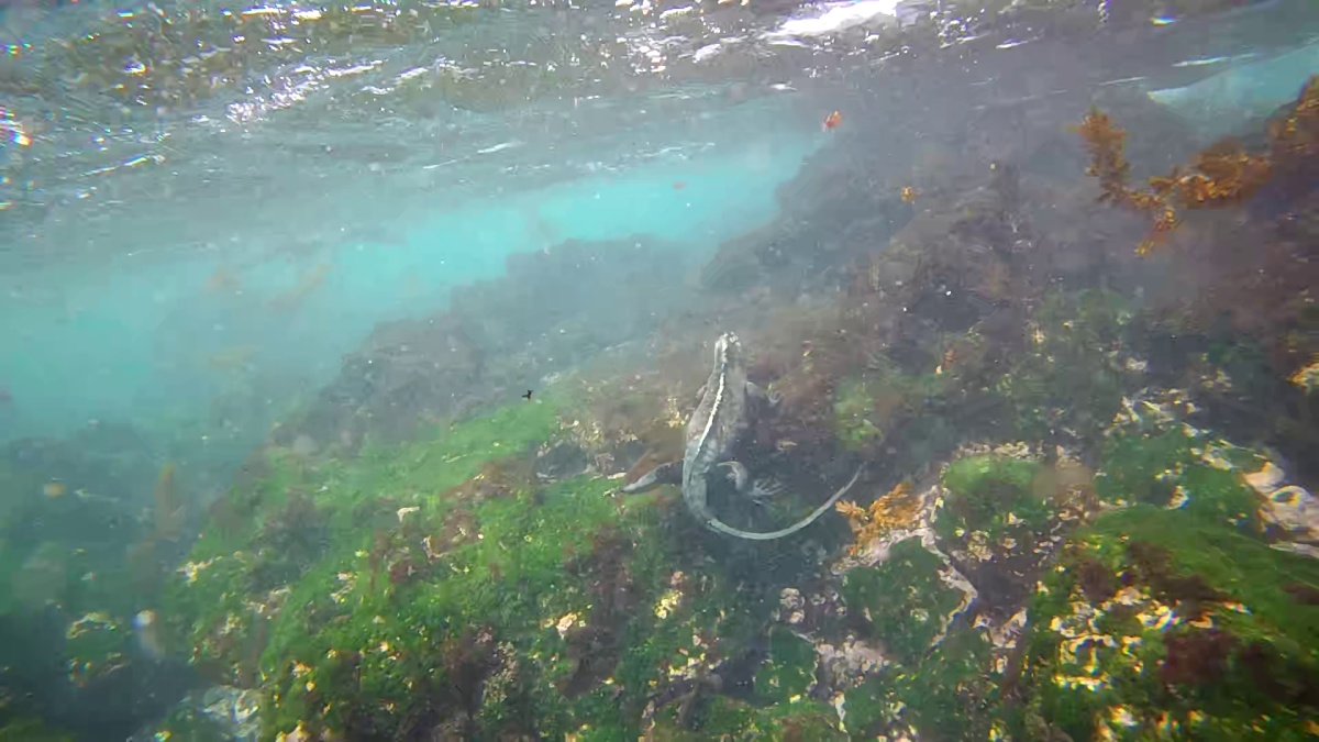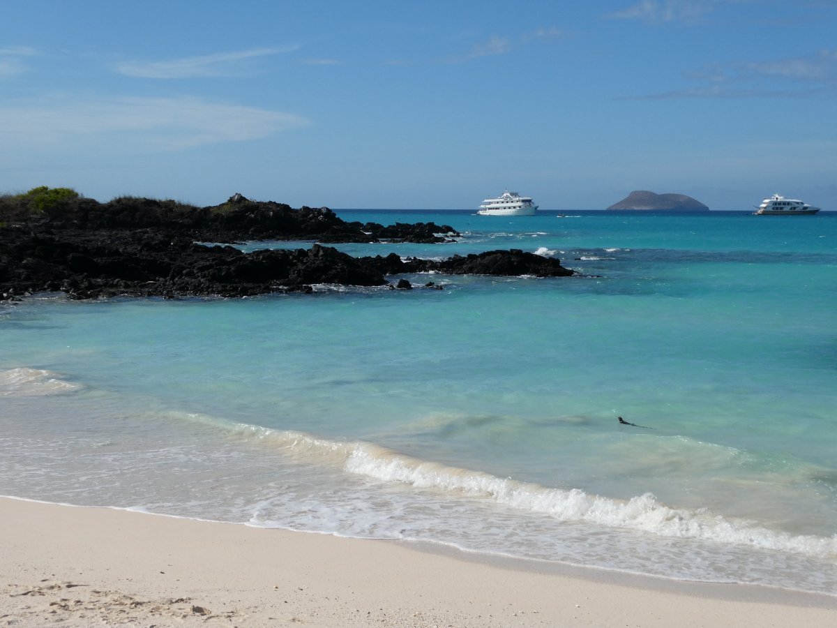We wasted no time and hit the first beach, making the acquaintance of the first of many marine iguanas. You can see one swimming by.