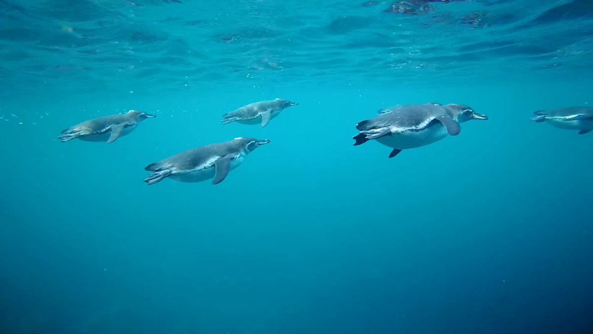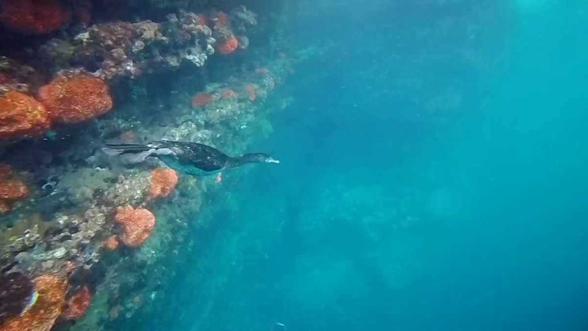 I was watching a seal who seemed to be asleep., almost close enough to touch. He barely moved. Suddenly, a whole squadrom of penguins came shooting by, a flightless cormoran was just as fast, straight as a spear and another sealion showed his underwater gymnastic skills as he went by on his back. The turtle was a picture of complete elegance, oblivious to my presence. The marine iguana chewed on some of the underwater vegetables. I had been hoping to catch one diving into the ocean, but they were just too fast.